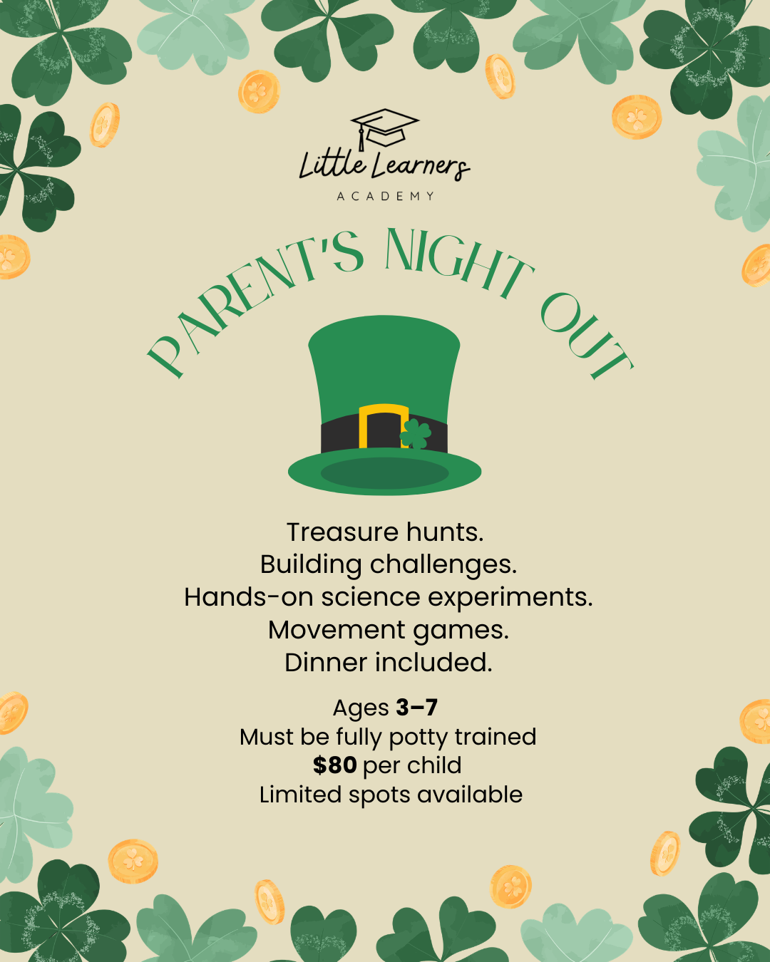 Our Pot of Gold STEM Night blends treasure hunts, engineering challenges, and engaging science experiments into a thoughtfully structured evening your child will love. It’s not just green snacks and glitter. We’re mixing in real problem-solving, building, and discovery to keep little minds active and excited from start to finish.