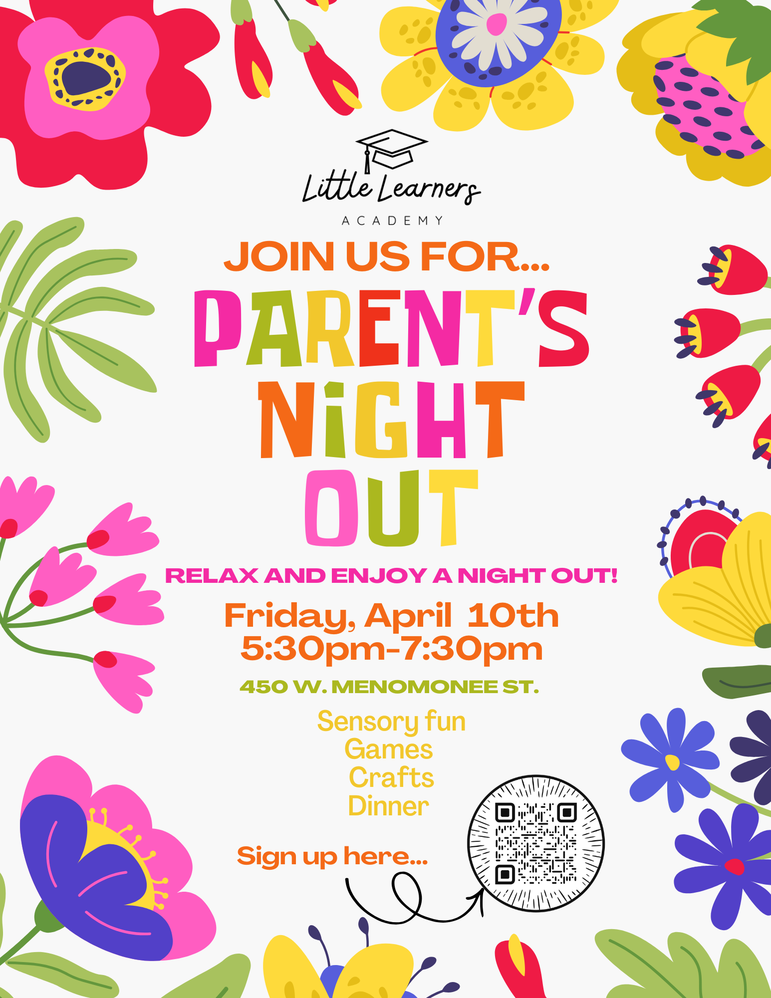 Dinner is included, and the night will also feature movement games and structured activities in our warm, safe, and nurturing environment.